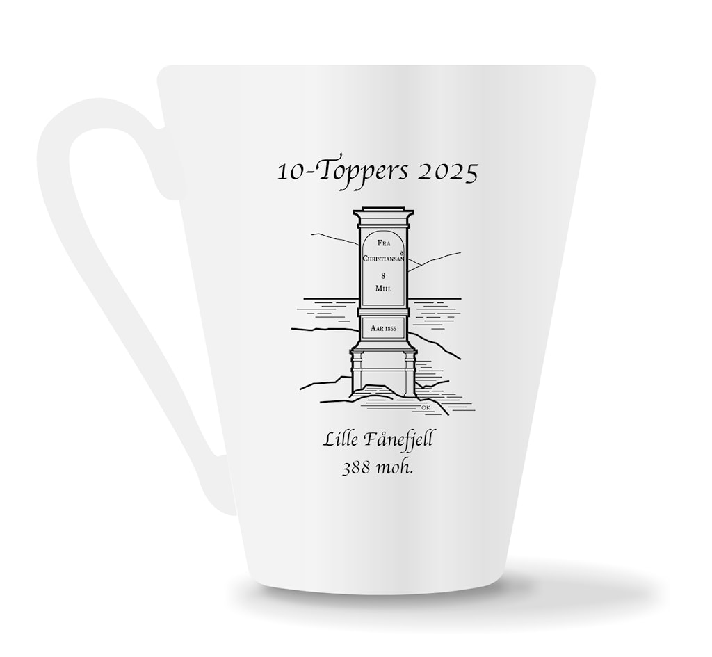 Kruse som ble designet for 2025. Kruset som vi fikk kjøpt inn var litt annerledes, men emblemet er det samme. Vi fikk ikke tak i flere av de gamle krusa.